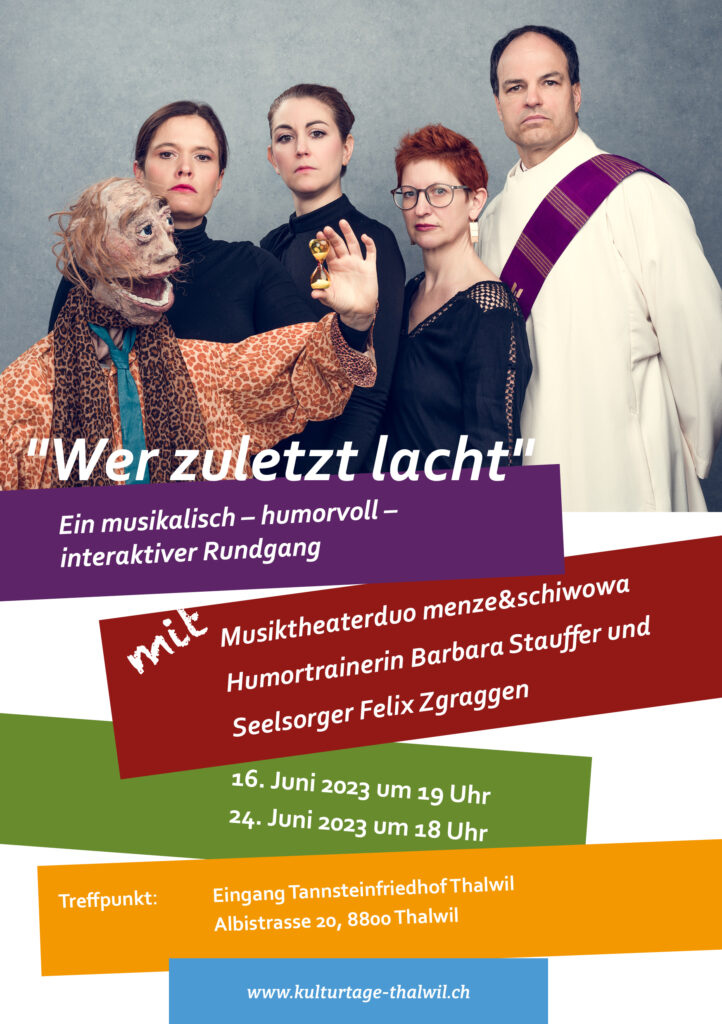 An den Kulturtagen Thalwil zusammen mit Julia Schiwowa, Lucia Schneider-Menz (Duo menze&schiwowa, Musiktheater) und Felix Zgraggen (Seelsorger): Wer zuletzt lacht. Wir können von den Verstorbenen lernen: Leben wir bewusst im Hier und Jetzt, dankbar und mutig, und das am besten mit einer gewissen Bewusstseinserheiterung!