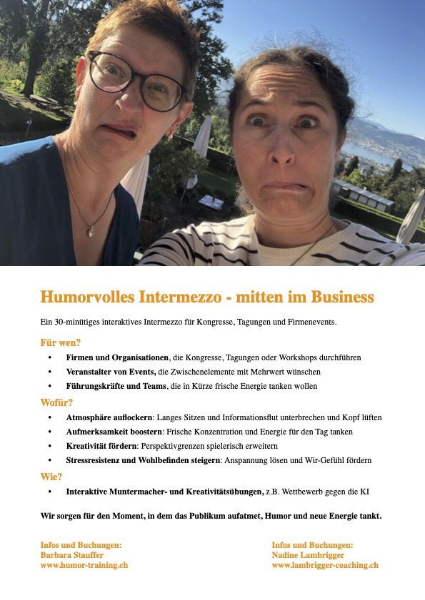 Habt ihr lange, anstrengende Trainings, Sitzungen, Konferenzen? Dann ist ein humorvolles Intermezzo Gold wert. Ich mache das gemeinsam mit Nadine Lambrigger.