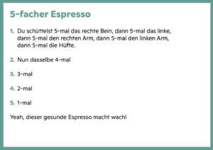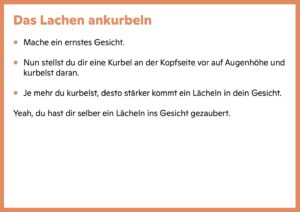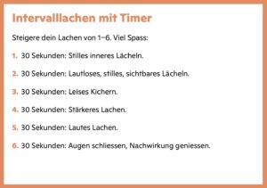 Die 5-Minuten-Übungen bieten sich auch bei Ermüdungserscheinungen an während des Tages. Alleine oder im Team, sich regelmässig einen Humorinput schnappen, und in 5 Minuten fühlst du dich munter, kreativ, wieder parat und motiviert fürs Business. Ja, so schnell kann’s gehen!
